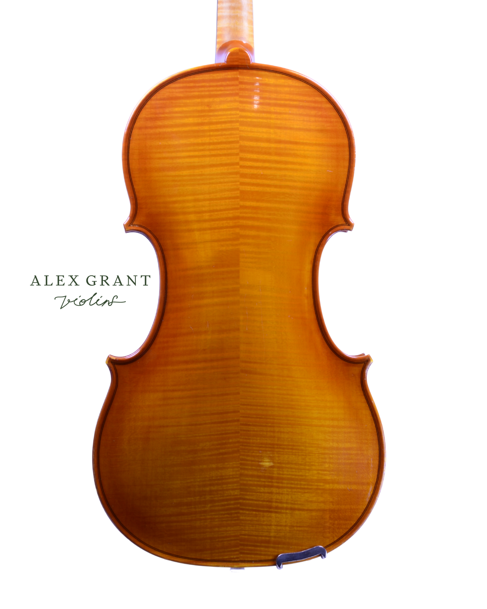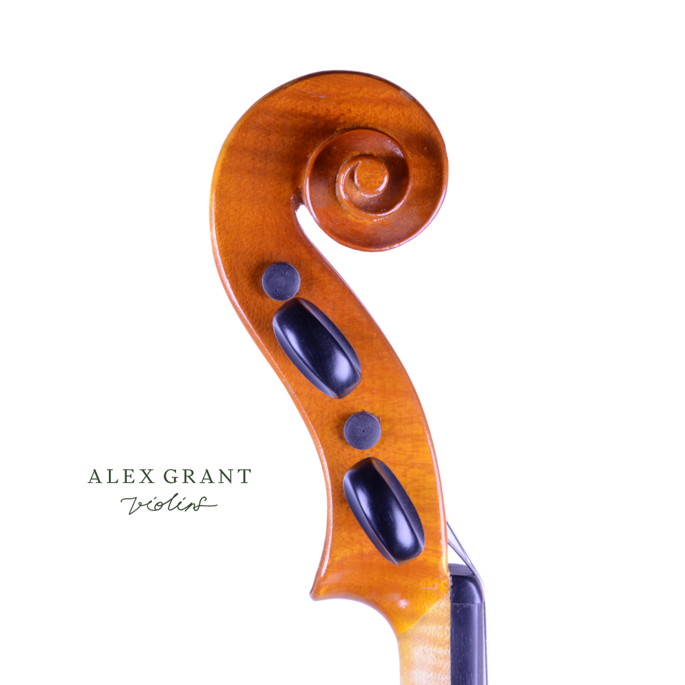 This 16 ¼” viola from 1986 is a typical example of his work and it produces a big, well balanced sound with the typical warmth of a large viola ‘C’ combined with the crisp, clear treble that offers both volume and carrying power. The back plate is of two pieces of medium, regularly flamed maple with matching sides and a fine spruce top plate. The varnish of a light golden brown.