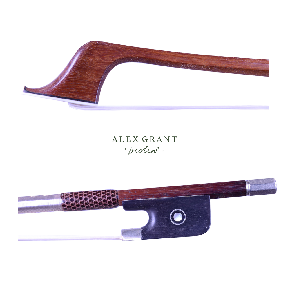 The bow has been attributed to Roger Françios Lotte, Mirecourt, and on viewing reference works, the head is so characteristic that one would have to agree. Lotte was recognised as a fine bowmaker who worked quickly and accurately. Many of his bows bear his own stamp but he supplied bows to some of the best know shops in Mirecourt and Paris and these often bear the stamp of these famous shops rather than his own.